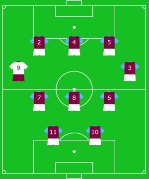 Villa have four defenders with low numbers, but all are centre-backs. Nathan Baker is first-choice with Ron Vlaar but for this we’ve had to shunt him to left-back, where he has played before, while Ciarán Clark is deployed in midfield. Baker’s position, and Agbonlahor wearing 11, mean that the missing numbers, 3 and 9, are in unconventional positions.